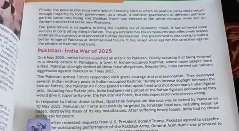കനത്ത നഷ്ടങ്ങള് നേരിട്ടതിനെ തുടര്ന്ന് ഇന്ത്യ സമാധാത്തിനായി യാചിക്കുകയായിരുന്നുവെന്നാണ് പാഠപുസ്കതത്തിലെ മറ്റൊരു വാചകം. യുഎസ് പ്രസിഡന്റ് ഡൊണാള്ഡ് ട്രംപിന്റെ ആവര്ത്തിച്ചുള്ള അഭ്യര്ത്ഥനകള്ക്ക് ശേഷം, പാകിസ്ഥാന് വെടിനിര്ത്തലിന് സമ്മതിച്ചവെന്നും കൂട്ടിച്ചേര്ക്കുന്നു. എന്നാല് യാതാര്ഥ്യം മറിച്ചാണ്. യുഎസ് വൈസ് പ്രസിഡന്റ് ജെഡി വാന്സ് പ്രധാനമന്ത്രി നരേന്ദ്ര മോദിയെ വിളിച്ച് വെടിനിര്ത്തല് ചര്ച്ചകള്ക്ക് ആഹ്വാനം ചെയ്തപ്പോള് പ്രധാനമന്ത്രി പറഞ്ഞത് മധ്യസ്ഥതയ്ക്ക് ഇന്ത്യക്ക് താതാപര്യമില്ലെന്നും പാകിസ്ഥാന് വെടി നിര്ത്തിയില്ലെങ്കില് ഇന്ത്യ കൂടുതല് പ്രഹരം സമ്മാനിക്കുമെന്നുമായിരുന്നു.