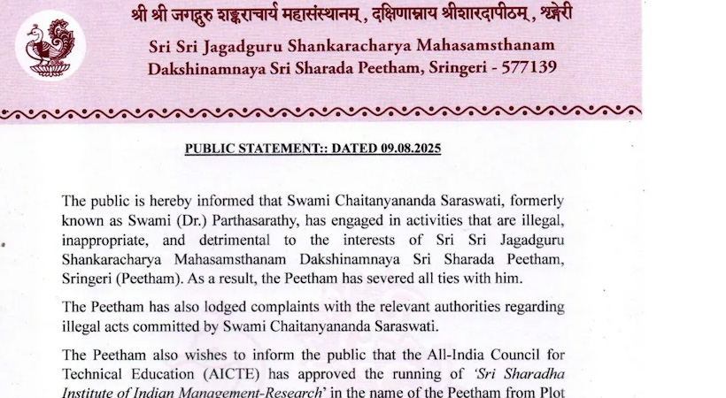 ആശ്രമം പുറത്തിറക്കിയ പ്രസ്താവനയില്, ‘സ്വാമി പാര്ത്ഥസാരഥി എന്നറിയപ്പെട്ടിരുന്ന സ്വാമി ചൈതന്യാനന്ദ സരസ്വതി നിയമവിരുദ്ധവും അനുചിതവുമായ പ്രവര്ത്തനങ്ങളില് ഏര്പ്പെട്ടിട്ടുള്ള പരാതിയുടെ അടിസ്ഥാനത്തില് അദ്ദേഹവുമായുള്ള മഠത്തിന്റെ എല്ലാ ബന്ധവും വിശ്ചേദിച്ചതായും സ്വാമി ചൈതന്യാനന്ദ സരസ്വതി നടത്തിയ നിയമവിരുദ്ധ പ്രവൃത്തികള് സംബന്ധിച്ച് ബന്ധപ്പെട്ട അധികാരികള്ക്ക് പരാതിയും നല്കിയിട്ടുണ്ടെന്നും വ്യക്തമാക്കി. ഡയറക്ടറായി സേവനമനുഷ്ഠിച്ച ശ്രീ ശാരദ ഇന്സ്റ്റിറ്റ്യൂട്ട് ഓഫ് ഇന്ത്യന് മാനേജ്മെന്റില് പഠിക്കുന്നവരാണ് പരാതി നല്കിയത്.