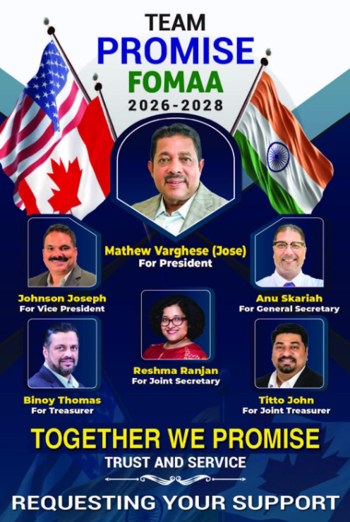 ഇതാദ്യമായി യുവതലമുറക്ക് വലിയ പ്രാധാന്യം നൽകി ഫോമായിൽ മാറ്റത്തിന്റെ കാഹളമായി ‘ടീം പ്രോമിസ്.’ അവിഭക്ത ഫൊക്കാനയിലും ഫോമയിലും മറ്റു സംഘടനകളിലും ദേശീയ നേതൃത്വത്തിൽ വിജയകരമായി പ്രവർത്തിച്ചിട്ടുള്ള മാത്യു വർഗീസ് (ജോസ്-ഫ്ലോറിഡ) നേതൃത്വം നൽകുന്ന ടീം പ്രോമിസ് പാനലിൽ ജനറൽ സെക്രട്ടറിയായി ഫിലാഡൽഫിയയിൽ നിന്ന് അനു സ്ക്കറിയയും ട്രഷററായി ന്യു യോർക്കിൽ നിന്ന് ബിനോയി തോമസും വൈസ് പ്രസിഡന്ടായി കാലിഫോർണിയയിൽ നിന്ന് ജോൺസൺ ജോസഫും ജോ. സെക്രട്ടറി ആയി ഡാലസിൽ നിന്ന് രേഷ്മാ രഞ്ജനും ജോ. ട്രഷററായി ഫ്ലോറിഡയിൽ നിന്ന് ടിറ്റോ ജോണും മത്സരിക്കുന്നു.