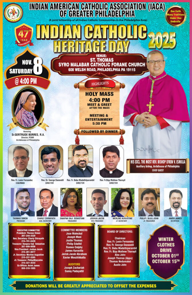 തേജസ്സുറ്റ പ്രവർത്തനങ്ങളിലൂടെ അമേരിക്കൻ മലയാളികത്തോലിക്കർക്കു മാതൃകയായി സേവനത്തിന്റെ 47 വർഷം പൂർത്തിയാക്കുന്ന ഫിലാഡൽഫിയ കാത്തലിക് അസോസിയേഷൻ 2025 നവംബർ 8 ശനിയാഴ്ചയാണു ‘ഒരേ വിശ്വാസം, പല പാരമ്പര്യങ്ങൾ’ എന്ന ആപ്തവാക്യത്തിലൂന്നി ഇൻഡ്യൻ കത്തോലിക്കരുടെ പൈതൃകദിനാഘോഷങ്ങൾ സംഘടിപ്പിക്കുന്നത്.