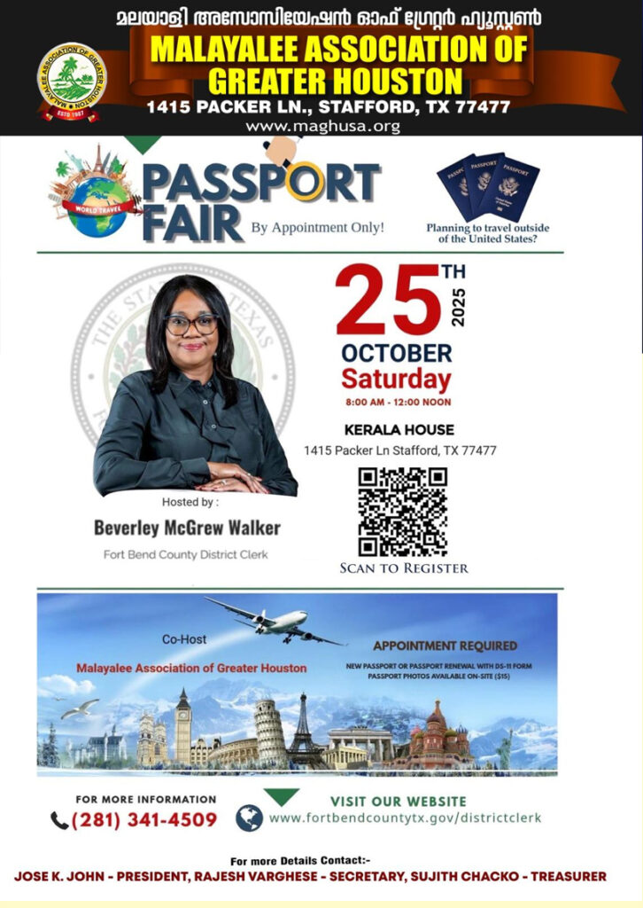 ഹൂസ്റ്റൺ (ടെക്സസ്): ഗ്രേറ്റർ ഹൂസ്റ്റൺ മലയാളി അസോസിയേഷൻ്റെയും (MAGH) ഫോർട്ട് ബെൻഡ് കൗണ്ടി ഡിസ്ട്രിക്ട് ക്ലർക്ക് ബെവർലി മക്ഗ്രെവ് വാൾക്കറുടേയും സംയുക്ത നേതൃത്വത്തിൽ പാസ്പോർട്ട് ഫെയർ സംഘടിപ്പിക്കുന്നു. 2025 ഒക്ടോബർ 25 ശനിയാഴ്ച സ്റ്റാഫോർഡിലെ കേരള ഹൗസിൽ രാവിലെ 8:00 മണി മുതൽ ഉച്ചയ്ക്ക് 12:00 മണി വരെയാണ് പാസ്പോർട്ട് ഫെയർ സമയം. വിദേശയാത്രകൾക്ക് പദ്ധതിയിടുന്നവർക്ക് ഈ അവസരം പ്രയോജനപ്പെടുത്താം. എന്നാൽ, ഇതിൽ പങ്കെടുക്കുന്നവർക്ക് അപ്പോയിന്റ്മെന്റ് നിർബന്ധമാണ്.