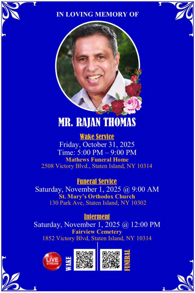 ദീര്ഘകാലം കേരളത്തില് ബിഎസ്എന്എല് ഉദ്യോഗസ്ഥനായിരുന്നു. 1997ല് കുടുംബസമേതം ന്യൂയോര്ക്കില് എത്തിയ രാജന് തോമസ് സ്റ്റാറ്റന് ഐലന്റ് കെയര് സെന്ററില് പ്രവര്ത്തിച്ചു. സെന്റ്മേരീസ് മലങ്കര ഓര്ത്തഡോക്സ് പള്ളി ഇടവകാംഗമാണ്.