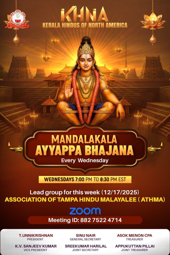ഫ്ലോറിഡ: മണ്ഡല-മകരവിളക്ക് തീർത്ഥാടന കാലത്തോടനുബന്ധിച്ച് വടക്കേ അമേരിക്കയിലെ അയ്യപ്പ ഭക്തർക്കായി കേരള ഹിന്ദുസ് ഓഫ് നോർത്ത് അമേരിക്ക (KHNA) എല്ലാ ബുധനാഴ്ചയും ഓൺലൈൻ ‘മണ്ഡലകാല അയ്യപ്പ ഭജന’ നടത്തുന്നു.