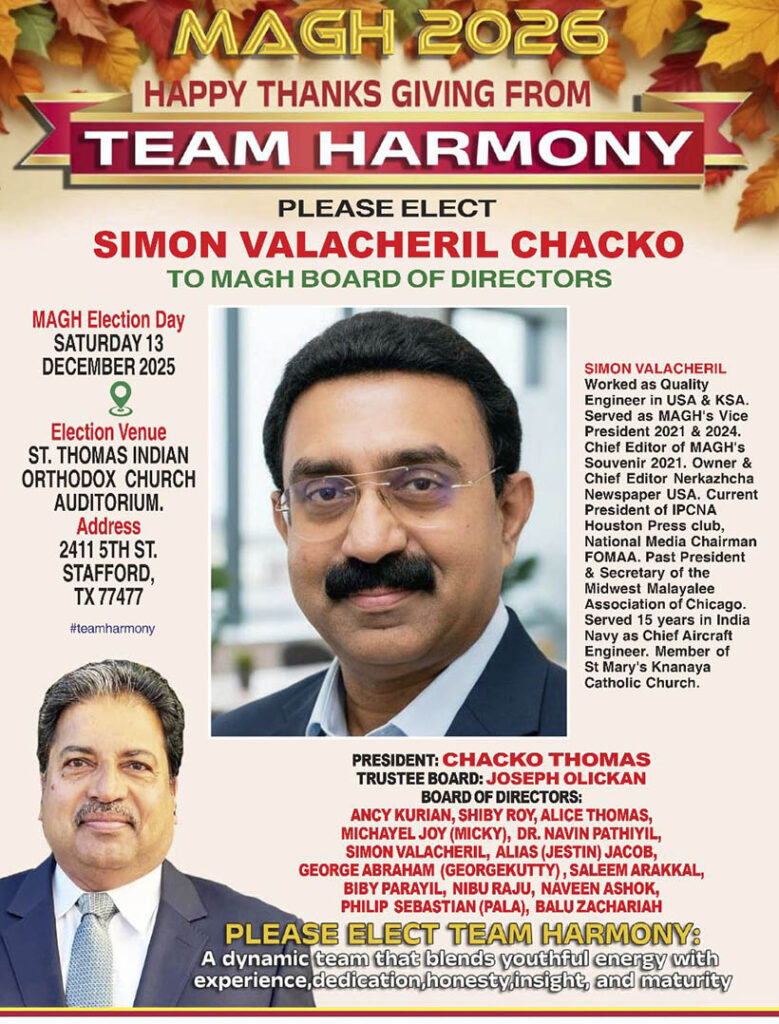 ഹൂസ്റ്റണ്: അംഗബലം, സമയബന്ധിതമായ പ്രവര്ത്തമികവ്, സാമ്പത്തിക ഭദ്രത, ജനകീയ കാഴ്ചപ്പാട് എന്നിങ്ങനെ ബഹുമുഖമായ സവിശേഷതയുള്ള അമേരിക്കയിലെ ഏറ്റവും വലിയ മലയാളി സംഘടനയായ ‘മാഗ്’ എന്ന ചുരുക്കപ്പേരില് പ്രശസ്തി നേടിയ മലയാളി അസോസിയേഷന് ഓഫ് ഗ്രേറ്റര് ഹൂസ്റ്റന്റെ ഭരണ സമിതിയിലേയ്ക്കുള്ള ആവേശകരമായ തിരഞ്ഞെടുപ്പ് നടക്കാന് പോവുകയാണ്. സ്വന്തമായി വസ്തുവും രണ്ട് കെട്ടിടങ്ങളുമുള്ള മാഗ് ഇതര സംഘടനകളില് നിന്നും വ്യത്യസ്തമായ പാതയിലൂടെയാണ് ജൈത്രയാത്ര തുടരുന്നത്. ഇതിനാല് ഇലക്ഷനും പൊടിപാറുമെന്നതില് സംശയമില്ല. അതേസമയം, പരിണതപ്രജ്ഞരായ സ്ഥാനാര്ത്ഥികള് അണിനിരക്കുന്ന ‘ടീം ഹാര്മണി’ പാനല് കാലോചിതമായ വിഷയങ്ങള് ഉയര്ത്തിപ്പിടിച്ച് പ്രചാരണത്തില് ഏറെ മുന്നേറിക്കഴിഞ്ഞു.