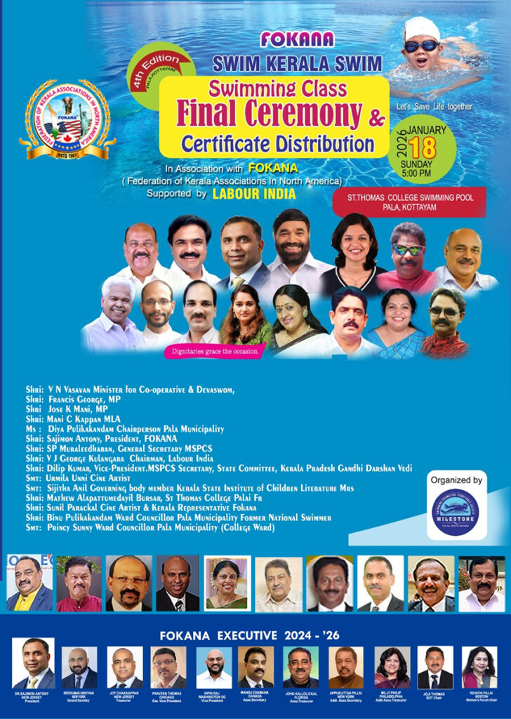കഴിഞ്ഞ വര്ഷം ഫൊക്കാന കേരള കണ്വന്ഷന്റെ ഭാഗമായി കുമരകത്തെ ഗോകുലം ഗ്രാന്റ് ഫൈവ് സ്റ്റാര് റിസോര്ട്ടിലെ സ്വിമ്മിങ് പൂളില് കുട്ടികളുടെ ആവേശകരമായ നീന്തല് പ്രകടനത്തോടെ, ജാഗ്രതയും കരുതലുമെന്ന സന്ദേശം പകര്ന്ന് ‘സ്വിം കേരള സ്വിം’ പദ്ധതിയുടെ മൂന്നാം ഘട്ടം വിജയകരമായി നടന്നിരുന്നു. ഇക്കുറി 500-ലധികം വിദ്യാര്ത്ഥികളാണ് ഗ്രാന്റ് പിനാലെയില് പങ്കെടുക്കുന്നതെന്ന് മൈല് സ്റ്റോണ് സ്വിമ്മിങ് പ്രമോട്ടിങ് ചാരിറ്റബിള് സൊസൈറ്റിയുടെ സെക്രട്ടറിയും റിട്ടയേഡ് എയര്ഫോഴ്സ് ഉദ്യോഗസ്ഥനുമായ ഡോ. ആര് പൊന്നപ്പന് പറഞ്ഞു.