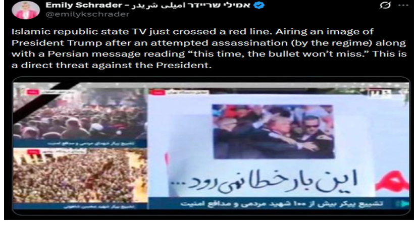 2024 ജൂലൈയില് പെന്സില്വാനിയയിലെ ബട്ലറില് നടന്ന തിരഞ്ഞെടുപ്പ് റാലിയില് നിന്നുള്ള ട്രംപിന്റെ ചിത്രമാണ് ഇറാനിയന് സ്റ്റേറ്റ് ടിവി സംപ്രേഷണം ചെയ്തത്. ഇറാനെതിരെ സൈനിക ആക്രമണം നടത്താന് ട്രംപ് ആലോചിക്കുന്നു എന്ന വാര്ത്ത പുറത്തു വന്നതിനു പിന്നാലെയാണ് അമേരിക്കന് പ്രസിഡന്റിന് നേരെ ഉയര്ത്തുന്ന ഏറ്റവും വലിയ ഭീഷണി ഈ പ്രക്ഷേപണത്തിലൂടെ ഇറാന് നടത്തിയത്.