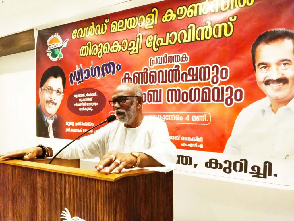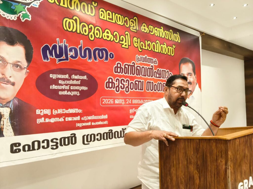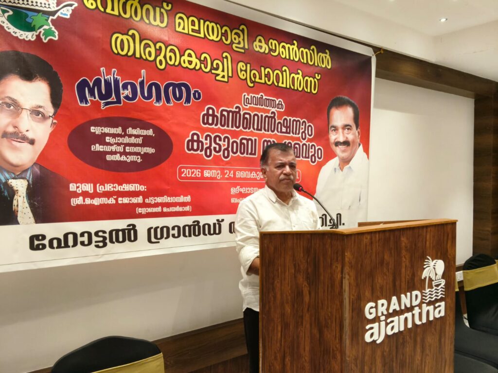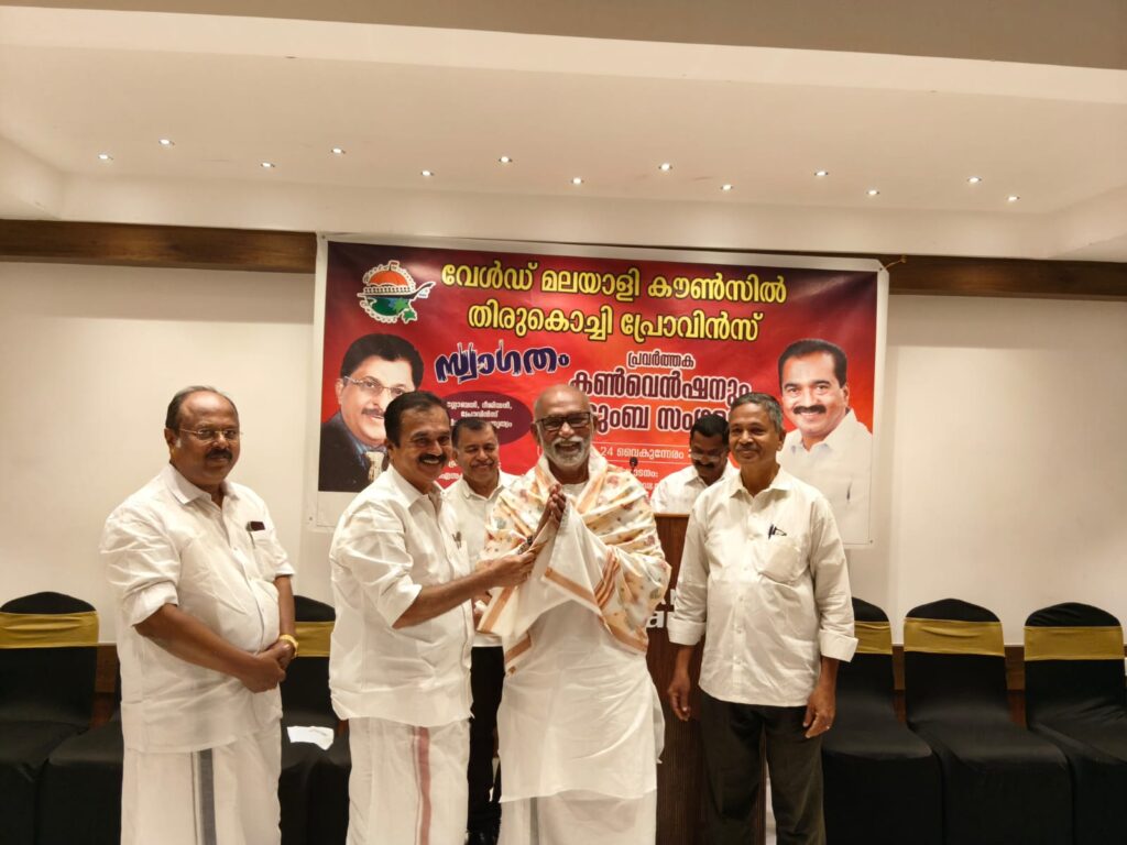 ലോകമെമ്പാടുമുള്ള മലയാളികള് തമ്മിലുള്ള സ്നേഹബന്ധം വിപുലപ്പെടുത്തുന്ന മഹാ സംഘടനയാണ് വേള്ഡ് മലയാളി കൗണ്സിലെന്നും ഈ കുടുംബാംഗങ്ങള്ക്ക് ഏതെങ്കിലും തരത്തിലുള്ള ആവശ്യമോ പ്രതിസന്ധി ഘട്ടമോ ഉണ്ടാവുമ്പോള് ഉടനടി സംഘടന സഹായ ഹസ്തവുമായെത്തുമെന്നും സമ്മേളനത്തില് അധ്യക്ഷത വഹിച്ച തിരുക്കൊച്ചി പ്രോവിന്സ് പ്രസിഡന്റ് വി.എം അബ്ദുള്ള ഖാന് പറഞ്ഞു. വേള്ഡ് മലയാളി കൗണ്സിലിന്റെ കുടുംബാംഗങ്ങളും അഭ്യുദയകാംക്ഷികളും സുഹൃത്തുക്കളും നിറഞ്ഞ സമ്മേളനം ചങ്ങനാശേരി എം.എല്.എ ജോബ് മൈക്കിള് നിലവിളക്ക് കൊളുത്തി ഉദ്ഘാടനം ചെയ്തു.