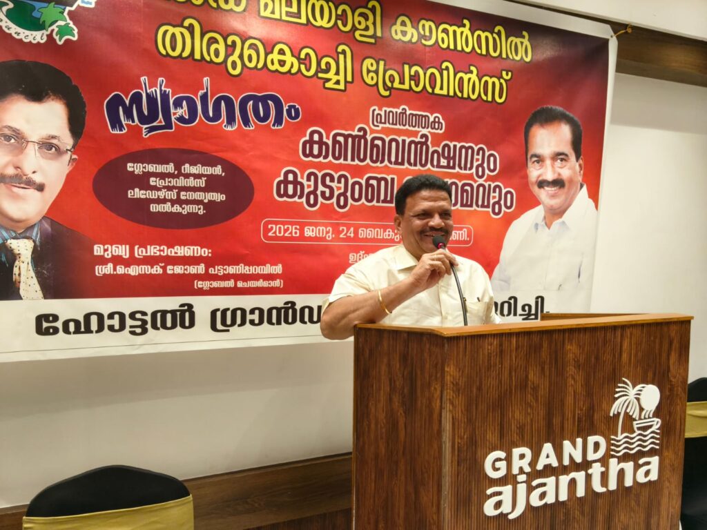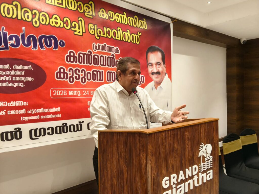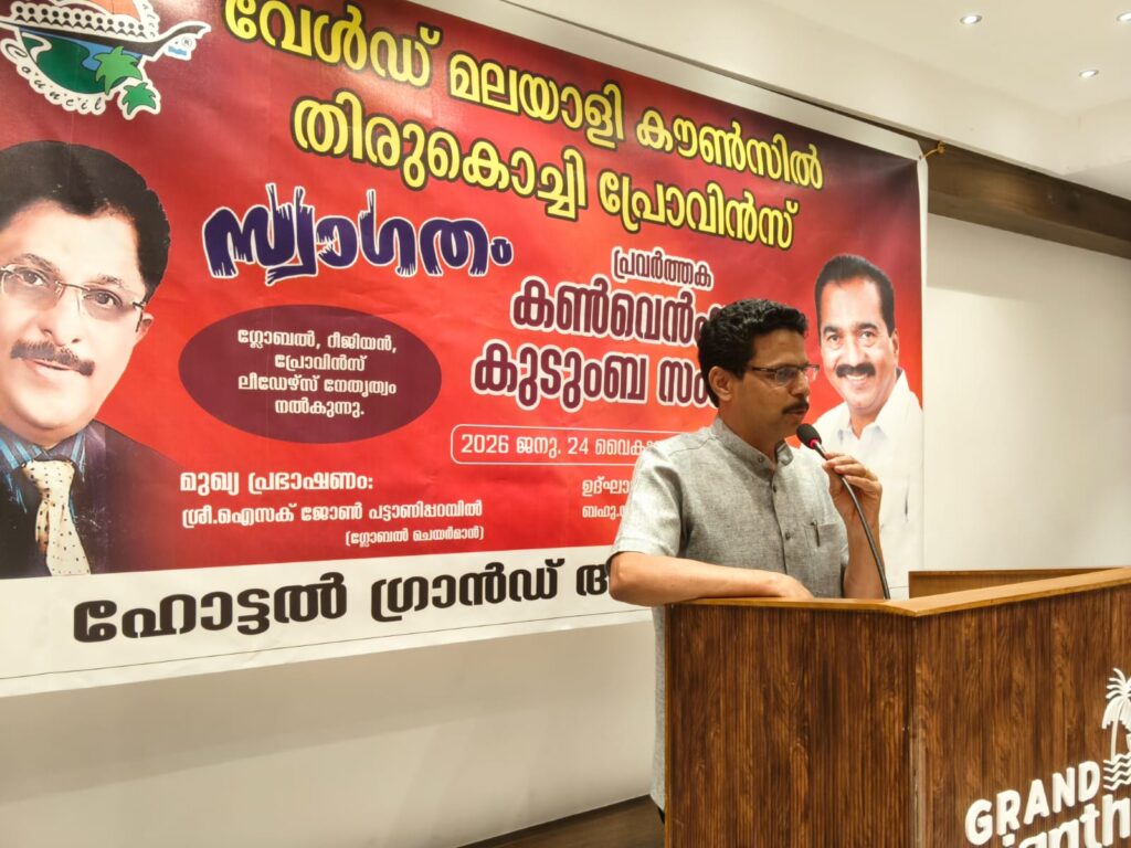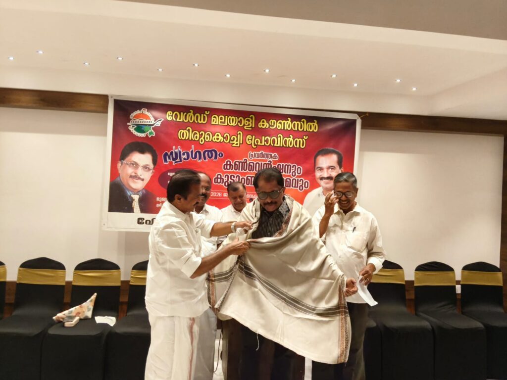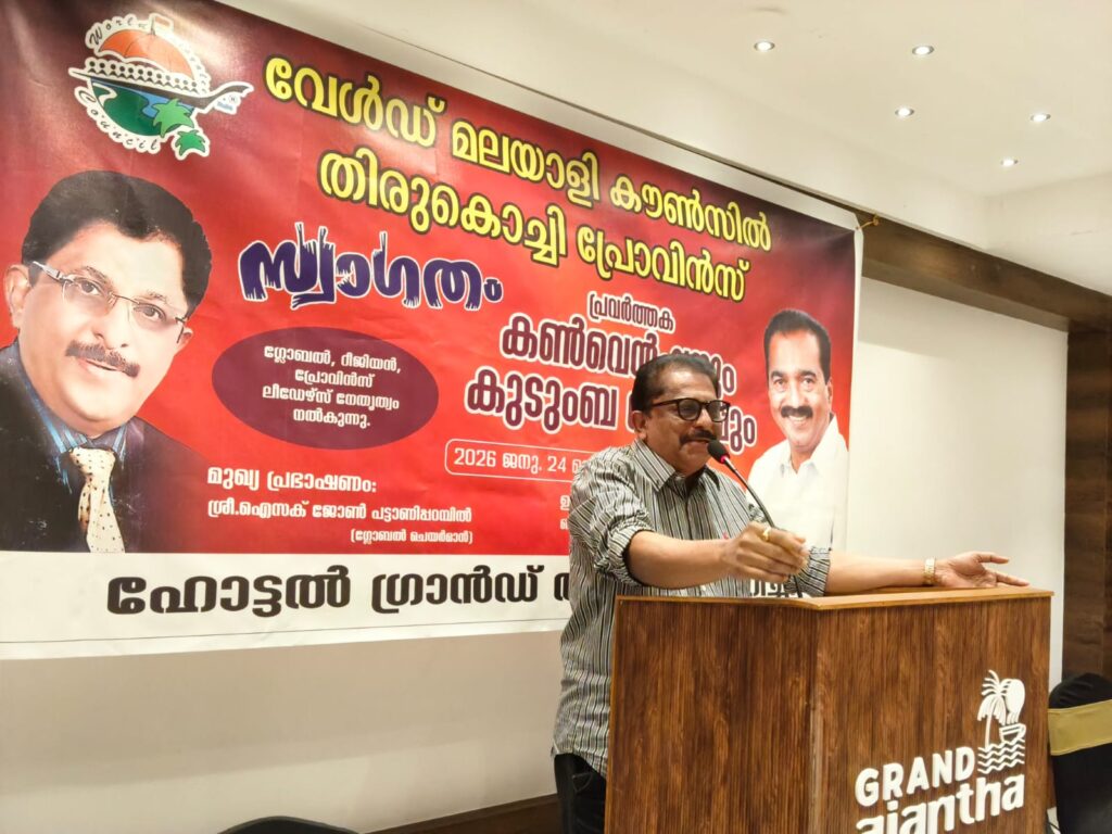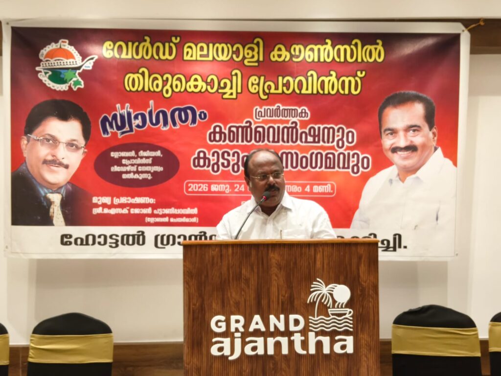 ചങ്ങനാശേരി: ലോകത്താകമാനം വസിക്കുന്ന മലയാളികളെ രാഷ്ട്രീയേതരമായി ഒരു കുടക്കീഴില് അണിനിരത്തുന്ന വേള്ഡ് മലയാളി കൗണ്സില്, തിരുക്കൊച്ചി പ്രോവിന്സിന്റെ ആഭിമുഖ്യത്തില് നടന്ന പ്രവര്ത്തക കണ്വന്ഷനും കുടുംബ സംഗമവും കൂട്ടായ്മയുടെ സ്നേഹസന്ദേശം പകര്ന്ന് ചങ്ങനാശേരിയില് സമാപിച്ചു. കുറിച്ചി ഗ്രാന്റ് അജന്ത ഹോട്ടലില് നടന്ന സമ്മേളനത്തില് വേള്ഡ് മലയാളി കൗണ്സില് ഗ്ലോബല് നേതാക്കള് ഉള്പ്പെടെയുള്ളവരും സാമൂഹിക സാംസ്കാരിക രംഗത്തെ വിശിഷ്ട വ്യക്തിത്വങ്ങളും സാന്നിധ്യമറിയിച്ചു. ആര്ച്ച രവീന്ദ്രന്റെ ‘ലോകം മുഴിവന് സുഖം പകരാനായ് സ്നേഹ ദീപമേ മിഴിതുറക്കൂ…’ എന്ന പ്രാര്ത്ഥനാ ഗാനത്തോടെ ആരംഭിച്ച സമ്മേളനത്തില് തിരുക്കൊച്ചി പ്രോവിന്സ് ചെയര്മാന് കെ.ആര് രവീന്ദ്രന് ഏവര്ക്കും സ്വാഗതമാശംസിച്ചു.
