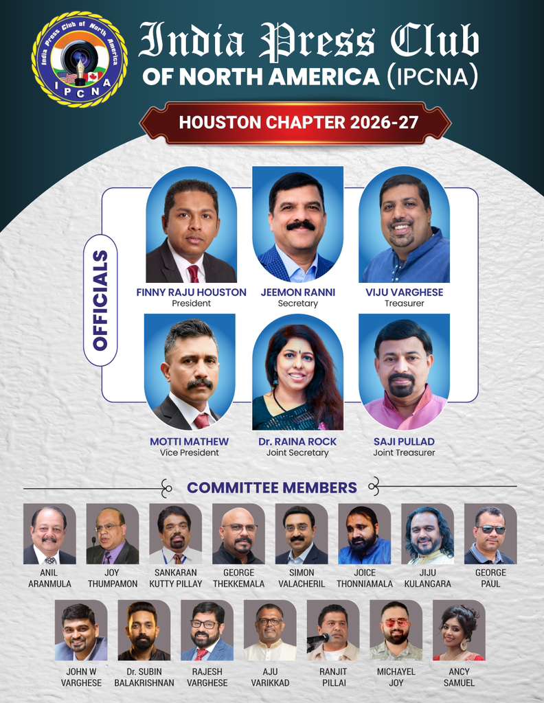 ഹൂസ്റ്റൺ: അടുത്ത രണ്ടു വർഷങ്ങൾ വൈവിധ്യമാർന്ന പരിപാടികൾ ഒരുക്കി അമേരിക്കൻ മാധ്യമ രംഗത്ത് സജീവ സാന്നിധ്യമാകുവാൻ പ്രതിജ്ഞയെടുത്ത് ഇന്ത്യ പ്രസ് ക്ലബ് ഓഫ് നോർത്ത് അമേരിക്ക (IPCNA) ഹൂസ്റ്റൺ ചാപ്റ്ററിന്റെ 2026-27 വർഷത്തേക്കുള്ള പുതിയ ഭാരവാഹികൾ ചുമതലയേറ്റു.