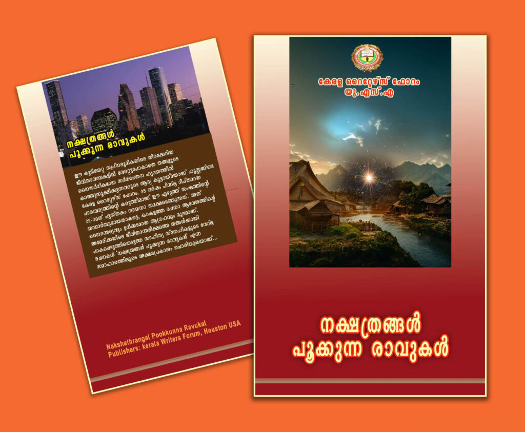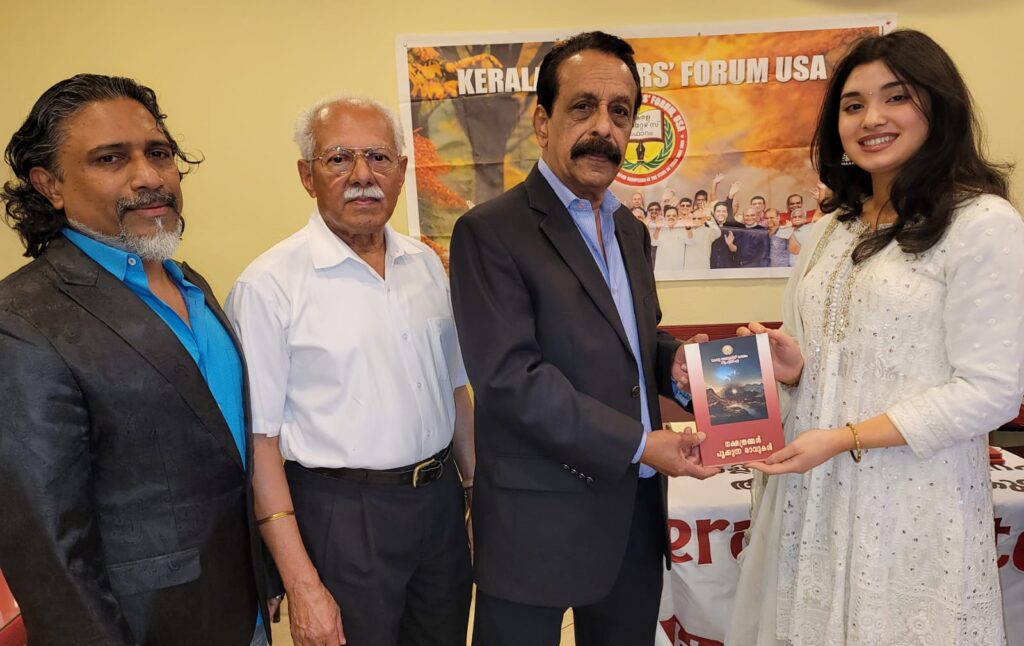 റൈറ്റേഴ്സ് ഫോറത്തിന്റെ 22-ാമത്തെ പുസ്തകമായ ‘നക്ഷത്രങ്ങള് പൂക്കുന്ന രാവുകള്’ എന്ന സമാഹാരത്തിന്റെ പ്രകാശനമായിരുന്നു ആദ്യത്തെ അജണ്ട. ചടങ്ങില് മുഖ്യാതിഥിയായ പ്രമുഖ അമേരിക്കന് മലയാളി ഗായികയും വയലിനിസ്റ്റുമായ റീവ മരിയ വര്ഗീസ് മാത്യു നെല്ലിക്കുന്നില് നിന്ന് പുസ്തകം ഏറ്റുവാങ്ങി പ്രകാശനം നിര്വഹിച്ചു. സംഗീത മാന്ത്രികന് എ.ആര് റഹ്മാനോടൊപ്പം ഒരു വര്ഷത്തേളം പ്രവര്ത്തിച്ച റീവ യൂണിവേഴ്സിറ്റി ഓഫ് ഹൂസ്റ്റണിലെ ബി.എം മ്യൂസിക് തെറാപ്പി വിദ്യാര്ത്ഥിനിയാണ്.