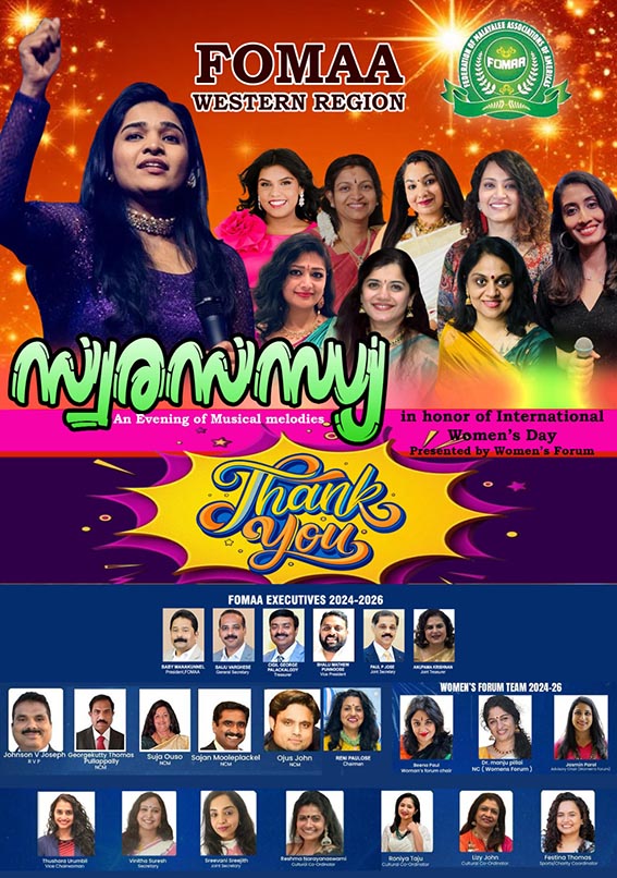 കാലിഫോര്ണിയ: ആസ്വാദക മനസുകളെ അനുഭൂതിയുടെ സാന്ദ്രലയത്തില് ആറാടിച്ച ‘സ്വരസന്ധ്യ’ എന്ന സായാഹ്ന സംഗീത പരിപാടി ഫോമ വെസ്റ്റേണ് റീജിയന്റെ മകുടത്തില് ഒരു പൊന്തൂവല് കൂടി കൂട്ടിച്ചേര്ത്തു. ആര്.വി.പി ജോണ്സണ് ജോസഫിന്റെ മേല്നോട്ടത്തില്, ഫോമാ വെസ്റ്റേണ് റീജിയന് വിമന്സ് ഫോറത്തിന്റെ നേതാക്കളായ ബീന പോള്, ഡോ. മഞ്ജു പിള്ള, ജാസ്മിന് പരോള്, വിനിത സുകുമാരന് എന്നിവരുടെ നേതൃത്വത്തില്, അന്താരാഷ്ട്ര വനിതാ ദിനമായ മാര്ച്ച് എട്ടിന് ഞായറാഴ്ച സായാഹ്നത്തില് ആരംഭിച്ച ‘സ്വരസന്ധ്യ’ ഗാനങ്ങളുടെ മധുരിമയാലും ജനപങ്കാളിത്തം കൊണ്ടും ഹൃദ്യമായിരുന്നു.