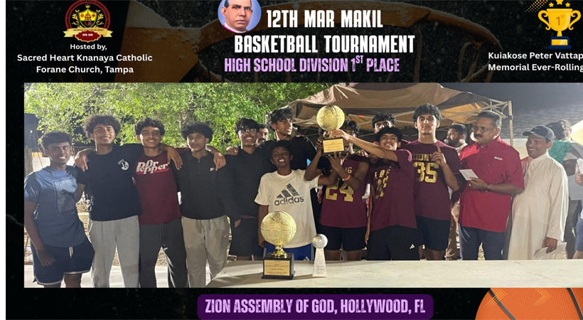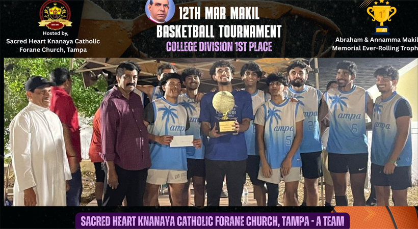താമ്പാ (ഫ്ളോറിഡ): സേക്രഡ് ഹാര്ട്ട് ക്നാനായാ കത്തോലിക്കാ ഫൊറോന പള്ളിയില് നടന്ന പന്ത്രണ്ടാമത് മാര് മാക്കീല് ബാസ്ക്കറ്റ്ബോള് ടൂര്ണമെന് ആവേശമായി മാറി. ശനിയാഴ്ച്ച രാവിലെ ഒന്പതു മണി മുതല് ആരംഭിച്ച മത്സരങ്ങള് രാത്രി എട്ടുമണിയോടെയാണ് സമാപിച്ചത്. ഫ്ലോറിഡ സംസ്ഥാനത്തെ വിവിധ മലയാളി ക്രൈസ്തവ ദേവാലയങ്ങളില് നിന്നായി മിഡില് സ്കൂള്, ഹൈസ്കൂള്, കോളേജ് വിഭാഗങ്ങളിലായി 15 ടീമുകള് മത്സരത്തില് പങ്കെടുത്തു.