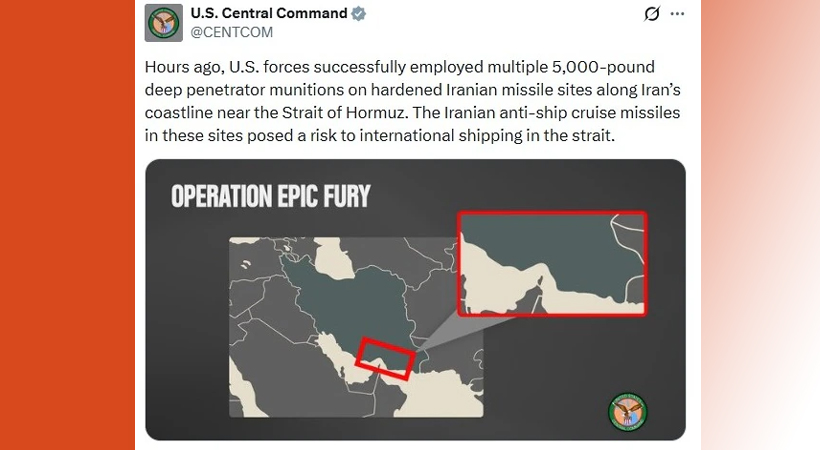 2,200 കിലോഗ്രാം ഭാരമുള്ള നിരവധി ബങ്കര്-ബസ്റ്റര് ബോംബുകള് ഉപയോഗിച്ച് ഹോര്മുസ് കടലിടുക്കിനടുത്തുള്ള ഇറാനിയന് മിസൈല് കേന്ദ്രങ്ങളിലേക്ക് ആക്രമണം നടത്തിയതായി യുഎസ് സെന്ട്രല് കമാന്ഡ് അറിയിച്ചു. കൂടാതെ ഹോര്മുസ് കടലിടുക്കിനടുത്തുള്ള ഇറാന്റെ തീരപ്രദേശത്ത് പെനട്രേറ്റര് പ്രയോഗിച്ചതായി യുഎസ് സെനിക കമാന്ഡ് ട്വീറ്റ് ചെയ്തു.