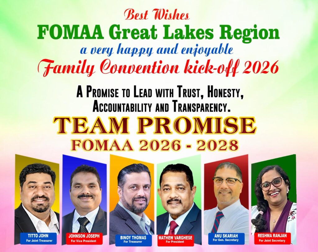 ഒഹായോ: വിശ്വാസവും സത്യസന്ധന്ധതയും ഉത്തരവാദിത്തവും സുതാര്യതയും മുഖമുദ്രയാക്കി ഫോമായുടെ 2026-’28 ഭരണ സമിതിയിലേയ്ക്ക് തികഞ്ഞ ആത്മവിശ്വാസത്തോടെ ജനവിധി തേടുന്ന ‘ടീം പ്രോമീസ്’ ഫോമാ ഫാമിലി കണ്വന്ഷന് 2026 സംബന്ധിച്ച ഗ്രേറ്റ് ലേക്സ് റീജിയന്റെ കിക്ക് ഓഫില് നിറസാന്നിധ്യമായി. 21-ാം തീയതി 4 മണിക്ക് അറോറ ഹാത്രോണില് വന് ജനാവലിയുടെ സാന്നിധ്യത്തില് നടന്ന സ്പ്രിങ് ഗെറ്റ് റ്റുഗദറിലും കണ്വന്ഷന് കിക്ക് ഓഫിലും മാത്യു വര്ഗീസ് നേതൃത്വം നല്കുന്ന ‘ടീം പ്രോമീസ്’ പാനല് അംഗങ്ങള്ക്ക് ഊഷ്മള വരവേല്പ്പാണ് ലഭിച്ചത്.